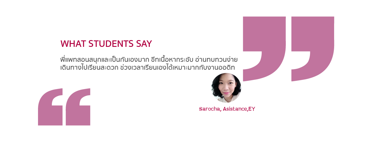 ผู้สอนคืออดีต Manager Big-4 ที่พร้อมจะแชร์ประสบการณ์ตรงเพื่อให้ผู้เรียนนำไปประยุกต์ใช้ มีประสบการณ์ติวมากว่า 10 ปี พร้อมที่จะอธิบายและตอบคำถามทันที ถ้าเรียนแล้วไม่เข้าใจ ลุกมาถามได้ทันที
